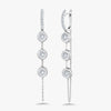 Three bezeled diamonds cascade gracefully from classic diamond huggies via delicate chains, creating an eye-catching statement piece. These versatile earrings work beautifully alone or stacked in multiple piercings for a bold, layered look.